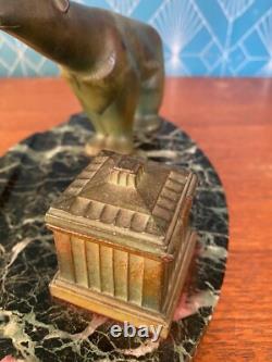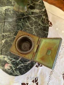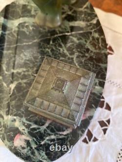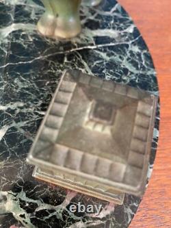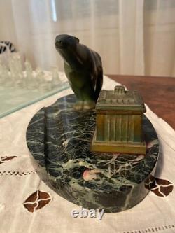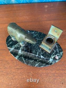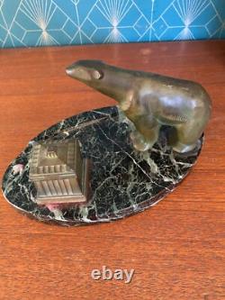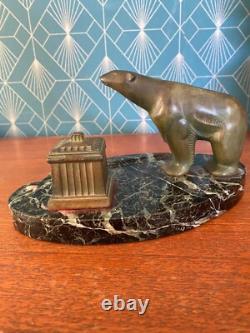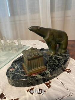 Patinated green bronze inkwell representing a polar bear. Base made of green sea marble. Art Deco period, around 1900.