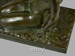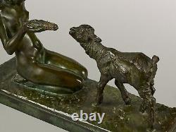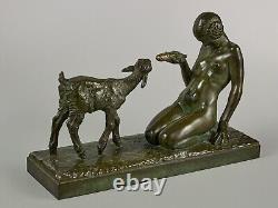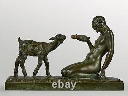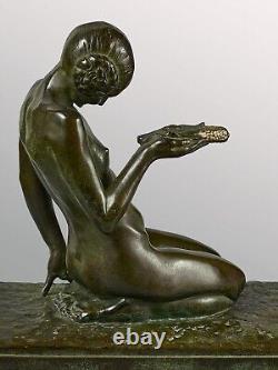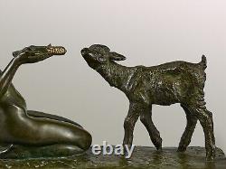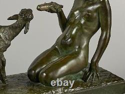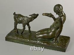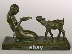 Sublime bronze and spectacular emerald green patina, from the Barbedienne foundry signature F. The work of Marcel Courbier won the Grand Prix National des Beaux-Arts upon its creation in 1926. Celebrated are: the grace of the young girl, the moving complicity with this little animal as fragile as it is docile, and the choice of a subject full of life, gentleness, and affection! Very high quality cast iron, called light, is made with the strict quantity of metal necessary for casting.