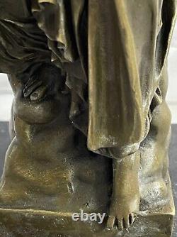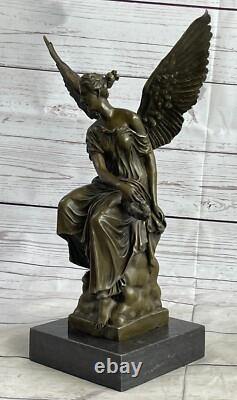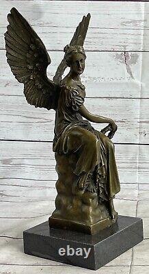 If you have any questions, please contact us. This sculpture is in perfect condition. Dimensions in bronze with marble base: Height 12" X Width 7". Marble dimensions: 6" X 4". Presenting an enchanting bronze sculpture that represents the ethereal beauty of an angel sitting on its celestial throne.