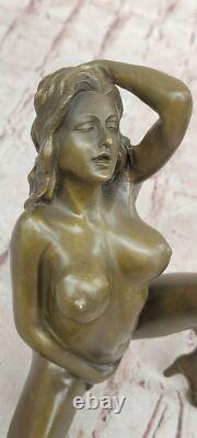 The poised and relaxed pose of the woman exudes an air of tranquil beauty, while the intricate details of her flowing hair and delicately sculpted features add an ethereal elegance to the overall composition. Crafted with a flawless bronze finish, this statue embodies a sense of timeless allure and refined sophistication, making it an ideal centerpiece for any discerning art lover or connoisseur of fine craftsmanship.Enhance your interior decor with the seductive charm and artistic finesse of this exquisite sculpture, designed to infuse your living space with a touch of classic elegance and understated beauty. The sturdy marble base on which the sculpture rests provides a stable foundation, elevating the overall aesthetic appeal of the piece while complementing the rich bronze finish with a touch of refined sophistication.