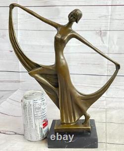 Statue sculpture sexy danseuse art déco style art nouveau style figurine en bronze. This sculpture is in perfect condition. Bronze dimensions with marble base: height 13" x width 12". Marble dimensions: 5" x 3". Height without base: 12 1/2.Exuding an aura of grace and elegance, the slender figurine is frozen mid-dance, its form evoking a striking two-dimensional appearance reminiscent of a sculpted wall relief, creating an intriguing abstract illusion. With a subtle gesture, it extends the delicate folds of its dress down to the ankles, accentuating the fluidity and dynamism of its movements.