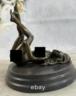 Cette sculpture est en parfait état. Dimensions en bronze avec base en marbre : Hauteur 8" X Largeur 8" Dimensions en marbre: diamètre 7 " Hauteur sans base: 7 " Poids: 8 livres Inventaire: 49st0614494. Cette sculpture en bronze capture magistralement l'essence de la sensualité et du désir féminins. La séductrice est allongée sur le sol, sa silhouette dégageant un air de désir fiévreux. Chaque courbe et contour de son corps est méticuleusement conçu, célébrant la beauté intemporelle de la forme féminine.Fabriquée selon la méthode ancienne de moulage à la cire perdue, cette sculpture illustre la riche tradition de l'art du bronze. La finition patinée brune ajoute non seulement de la profondeur et du caractère à la pièce, mais sert également à préserver son allure pour les générations à venir. Reposant gracieusement sur un socle en marbre noir, cette sculpture porte fièrement la signature de l'artiste Mavchi, confirmant son authenticité et sa valeur artistique. Cette ouvre d'art captivante est une célébration du désir et de la féminité, ce qui en fait un ajout remarquable à toute collection d'art ou espace intérieur.