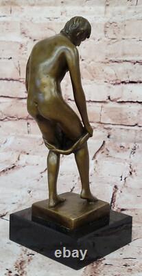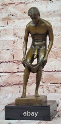 Cette sculpture est en parfait état. Dimensions en bronze avec base en marbre: hauteur 9 1/2 "x largeur 4". Dimensions en marbre: 4 "x 4". Hauteur sans base: 8 1/2. Dans cette sculpture en bronze audacieuse et expressive, l'artiste capture l'essence d'une figure masculine frappante et athlétique, rappelant un modèle de sous-vêtements.